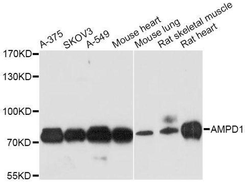 Adenosine monophosphate deaminase 1 catalyzes the deamination of AMP to IMP in skeletal muscle and plays an important role in the purine nucleotide cycle. Two other genes have been identified, AMPD2 and AMPD3, for the liver- and erythocyte-specific isoforms, respectively. Deficiency of the muscle-specific enzyme is apparently a common cause of exercise-induced myopathy and probably the most common cause of metabolic myopathy in the human. Alternatively spliced transcript variants encoding different isoforms have been identified in this gene.,AMPD1,MAD,MADA,MMDD,Cancer,Signal Transduction,Endocrine & Metabolism,AMPD1