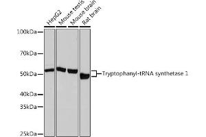 Aminoacyl-tRNA synthetases catalyze the aminoacylation of tRNA by their cognate amino acid. Because of their central role in linking amino acids with nucleotide triplets contained in tRNAs, aminoacyl-tRNA synthetases are thought to be among the first proteins that appeared in evolution. Two forms of tryptophanyl-tRNA synthetase exist, a cytoplasmic form, named WARS, and a mitochondrial form, named WARS2. Tryptophanyl-tRNA synthetase (WARS) catalyzes the aminoacylation of tRNA(trp) with tryptophan and is induced by interferon. Tryptophanyl-tRNA synthetase belongs to the class I tRNA synthetase family. Four transcript variants encoding two different isoforms have been found for this gene. [provided by RefSeq, Jul 2008],GAMMA-2, IFI53, IFP53,Epigenetics & Nuclear Signaling,WARS