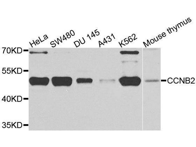 Dieser Kaninchen Polyklonal Antikörper detektiert spezifisch Cyclin B2 in WB und IHC. Es zeigt Reaktivität gegenüber Proben von Human. Es wurde in 2+ Publikationen zitiert.
