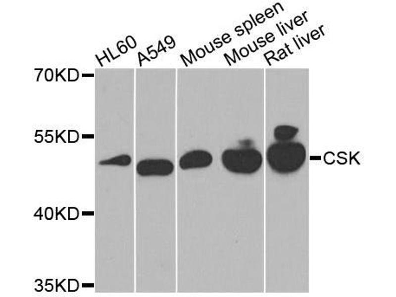 Non-receptor tyrosine-protein kinase that plays an important role in the regulation of cell growth, differentiation, migration and immune response. Phosphorylates tyrosine residues located in the C-terminal tails of Src-family kinases (SFKs including LCK, SRC, HCK, FYN, LYN, CSK or YES1. Upon tail phosphorylation, Src-family members engage in intramolecular interactions between the phosphotyrosine tail and the SH2 domain that result in an inactive conformation. To inhibit SFKs, CSK is recruited to the plasma membrane via binding to transmembrane proteins or adapter proteins located near the plasma membrane. Suppresses signaling by various surface receptors, including T-cell receptor (TCR and B-cell receptor (BCR by phosphorylating and maintaining inactive several positive effectors such as FYN or LCK.,CSK,Signal Transduction,Kinase,Tyrosine kinases,Immunology & Inflammation,B Cell Receptor Signaling Pathway,CSK