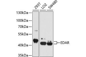 - This gene encodes a member of the tumor necrosis factor receptor family. The encoded transmembrane protein is a receptor for the soluble ligand ectodysplasin A, and can activate the nuclear factor-kappaB, JNK, and caspase-independent cell death pathways. It is required for the development of hair, teeth, and other ectodermal derivatives. Mutations in this gene result in autosomal dominant and recessive forms of hypohidrotic ectodermal dysplasia.,EDAR,DL,ECTD10A,ECTD10B,ED1R,ED3,ED5,EDA-A1R,EDA1R,EDA3,HRM1,Epigenetics & Nuclear Signaling,Signal Transduction,Cell Biology & Developmental Biology,Apoptosis,Growth factor,TNF,EDAR