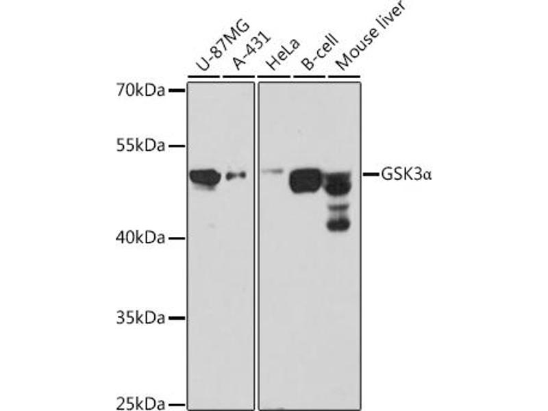 This gene encodes a multifunctional Ser/Thr protein kinase that is implicated in the control of several regulatory proteins including glycogen synthase, and transcription factors, such as JUN. It also plays a role in the WNT and PI3K signaling pathways, as well as regulates the production of beta-amyloid peptides associated with Alzheimer's disease.,GSK3 alpha,GSK3A,Epigenetics & Nuclear Signaling,Translation Control,Regulation of eIF4 and p70 S6 Kinase,Signal Transduction,Kinase,Serine/threonine kinases,PI3K-Akt Signaling Pathway,mTOR Signaling Pathway,ErbB-HER Signaling Pathway,MAPK-Erk Signaling Pathway,Cell Biology & Developmental Biology,Apoptosis,Inhibition of Apoptosis,Cell Cycle,Cell Adhesion,Protein folding,Wnt/β-Catenin Signaling Pathway,ESC Pluripotency and Differentiation,Endocrine & Metabolism,Insulin Receptor Signaling Pathway,Endocrine and metabolic diseases,Diabetes,Immunology & Inflammation,B Cell Receptor Signaling Pathway,Neuroscience,Neurodegenerative Diseases,Amyloid Plaque and Neurofibrillary Tangle Formation in Alzheimer's Disease,Stem Cells,Cardiovascular,Heart,Hypertrophy,Akt downstream targets,GSK3A
