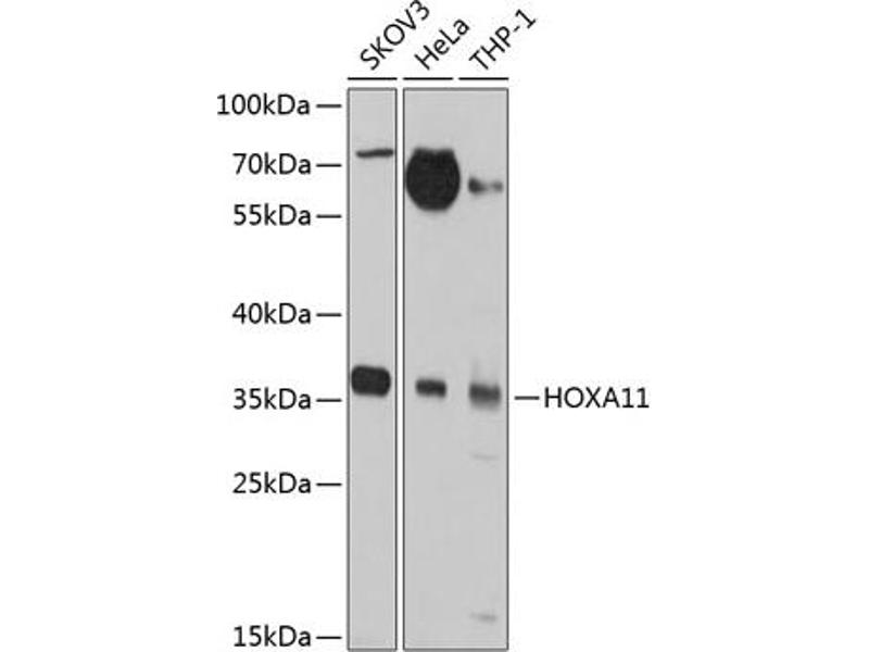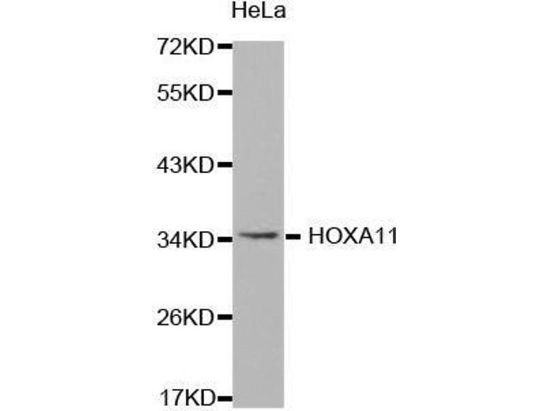 In vertebrates, the genes encoding the class of transcription factors called homeobox genes are found in clusters named A, B, C, and D on four separate chromosomes. Expression of these proteins is spatially and temporally regulated during embryonic development. This gene is part of the A cluster on chromosome 7 and encodes a DNA-binding transcription factor which may regulate gene expression, morphogenesis, and differentiation. This gene is involved in the regulation of uterine development and is required for female fertility. Mutations in this gene can cause radio-ulnar synostosis with amegakaryocytic thrombocytopenia.,HOXA11,HOX1,HOX1I,RUSAT1,Epigenetics & Nuclear Signaling,Transcription Factors,HOXA11