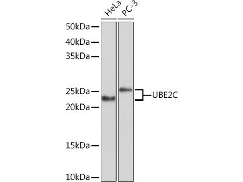 The modification of proteins with ubiquitin is an important cellular mechanism for targeting abnormal or short-lived proteins for degradation. Ubiquitination involves at least three classes of enzymes: ubiquitin-activating enzymes, ubiquitin-conjugating enzymes, and ubiquitin-protein ligases. This gene encodes a member of the E2 ubiquitin-conjugating enzyme family. The encoded protein is required for the destruction of mitotic cyclins and for cell cycle progression, and may be involved in cancer progression. Multiple transcript variants encoding different isoforms have been found for this gene. Pseudogenes of this gene have been defined on chromosomes 4, 14, 15, 18, and 19. [provided by RefSeq, Aug 2013],UBCH10, dJ447F3.2,Apoptosis,Cell Biology & Developmental Biology,Epigenetics & Nuclear Signaling,Ubiquitin,Ubiquitin_Ubiquitin-Proteasome Signaling Pathway,UBE2C