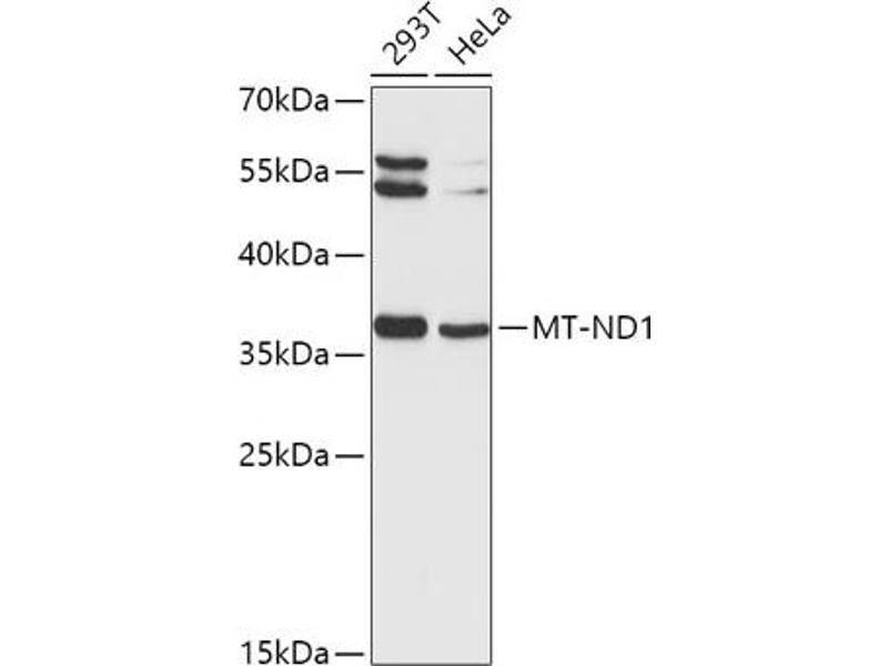 Der Kaninchen Polyklonal anti-MT-ND1 Antikörper (ABIN1680918) detektiert spezifisch MT-ND1 in WB.