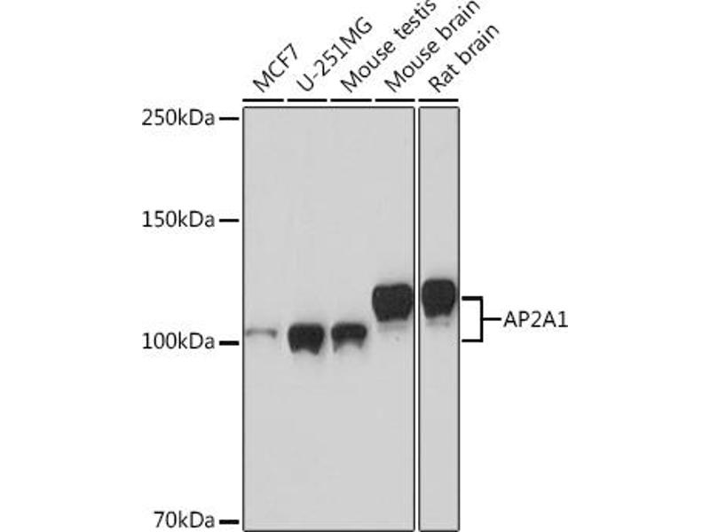 This gene encodes the alpha 1 adaptin subunit of the adaptor protein 2 (AP-2) complex found in clathrin coated vesicles. The AP-2 complex is a heterotetramer consisting of two large adaptins (alpha or beta), a medium adaptin (mu), and a small adaptin (sigma). The complex is part of the protein coat on the cytoplasmic face of coated vesicles which links clathrin to receptors in vesicles. Alternative splicing of this gene results in two transcript variants encoding two different isoforms. A third transcript variant has been described, but its full length nature has not been determined. [provided by RefSeq, Jul 2008],ADTAA, AP2-ALPHA, CLAPA1,Cell Biology & Developmental Biology,Neurodegenerative Diseases,Neuroscience,Notch Signaling Pathway,Signal Transduction,AP2A1