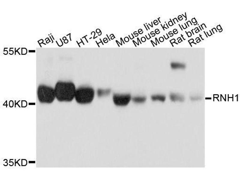 Der Kaninchen Polyklonal anti-RNH1 Antikörper (ABIN1682553) detektiert spezifisch RNH1 in WB und IF.