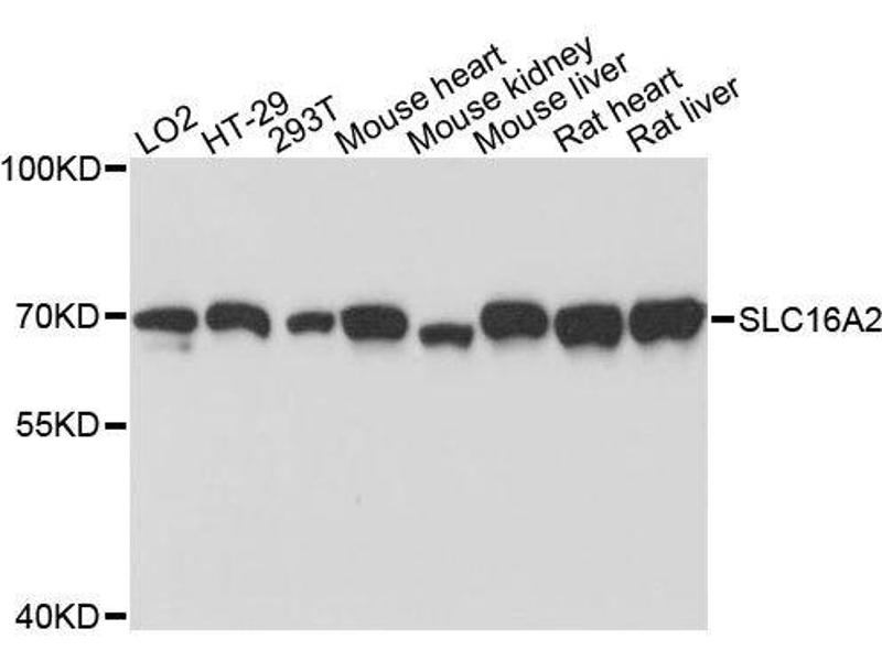 This gene encodes an integral membrane protein that functions as a transporter of thyroid hormone. The encoded protein facilitates the cellular importation of thyroxine (T4), triiodothyronine (T3), reverse triiodothyronine (rT3) and diidothyronine (T2). This gene is expressed in many tissues and likely plays an important role in the development of the central nervous system. Loss of function mutations in this gene are associated with psychomotor retardation in males while females exhibit no neurological defects and more moderate thyroid-deficient phenotypes. This gene is subject to X-chromosome inactivation. Mutations in this gene are the cause of Allan-Herndon-Dudley syndrome.,SLC16A2,AHDS,DXS128,DXS128E,MCT 7,MCT 8,MCT7,MCT8,MRX22,XPCT,Signal Transduction,Cell Biology & Developmental Biology,Growth factor,Endocrine & Metabolism,Neuroscience,SLC16A2
