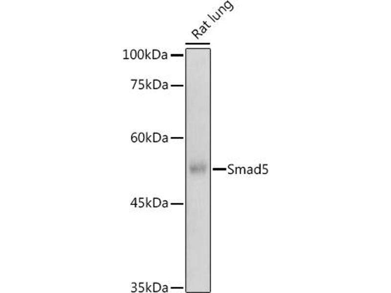 The protein encoded by this gene is involved in the transforming growth factor beta signaling pathway that results in an inhibition of the proliferation of hematopoietic progenitor cells. The encoded protein is activated by bone morphogenetic proteins type 1 receptor kinase, and may be involved in cancer. Alternative splicing results in multiple transcript variants.,DWFC,JV5-1,MADH5,SMAD5,Epigenetics & Nuclear Signaling,Signal Transduction,Cell Biology & Developmental Biology,TGF-b-Smad Signaling Pathway,ESC Pluripotency and Differentiation,Stem Cells,SMADs,Smad5