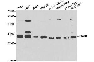 The Drosophila embryonic protein snail is a zinc finger transcriptional repressor which downregulates the expression of ectodermal genes within the mesoderm. The nuclear protein encoded by this gene is structurally similar to the Drosophila snail protein, and is also thought to be critical for mesoderm formation in the developing embryo. At least two variants of a similar processed pseudogene have been found on chromosome 2.,SNAI1,SLUGH2,SNA,SNAH,SNAIL,SNAIL1,dJ710H13.1,Epigenetics & Nuclear Signaling,Transcription Factors,Cancer,Cardiovascular,Heart,Cardiogenesis,SNAI1
