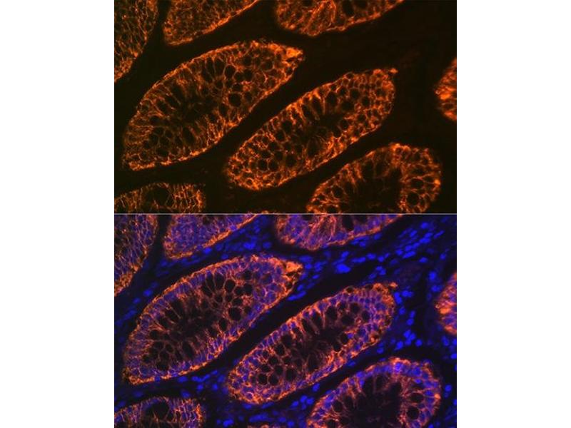 The glycoprotein encoded by this gene is a cell surface antigen that is expressed in greater than 95 % of human colon cancers. The open reading frame encodes a 319-amino acid polypeptide having a putative secretory signal sequence and 3 potential glycosylation sites. The predicted mature protein has a 213-amino acid extracellular region, a single transmembrane domain, and a 62-amino acid intracellular tail. The sequence of the extracellular region contains 2 domains characteristic of the CD2 subgroup of the immunoglobulin (Ig) superfamily. [provided by RefSeq, Jul 2008],A33,Cancer,Immunology & Inflammation,Tumor biomarkers,Tumor immunology,Tumor immunology_Tumor-associated antigens,GPA33