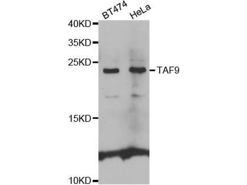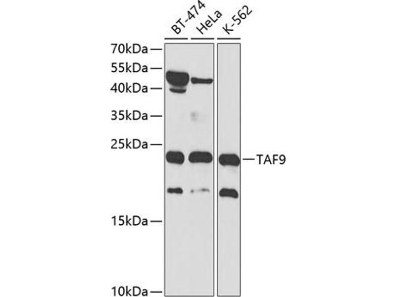 Initiation of transcription by RNA polymerase II requires the activities of more than 70 polypeptides. The protein that coordinates these activities is transcription factor IID (TFIID), which binds to the core promoter to position the polymerase properly, serves as the scaffold for assembly of the remainder of the transcription complex, and acts as a channel for regulatory signals. TFIID is composed of the TATA-binding protein (TBP) and a group of evolutionarily conserved proteins known as TBP-associated factors or TAFs. TAFs may participate in basal transcription, serve as coactivators, function in promoter recognition or modify general transcription factors (GTFs) to facilitate complex assembly and transcription initiation. This gene encodes one of the smaller subunits of TFIID that binds to the basal transcription factor GTF2B as well as to several transcriptional activators such as p53 and VP16. In human, TAF9 and AK6 (GeneID: 102157402) are two distinct genes that share 5' exons. A similar but distinct gene (TAF9L) has been found on the X chromosome and a pseudogene has been identified on chromosome 19. Alternative splicing results in multiple transcript variants.,TAF9,MGC:5067,STAF31/32,TAF2G,TAFII-31,TAFII-32,TAFII31,TAFII32,TAFIID32,Epigenetics & Nuclear Signaling,TAF9