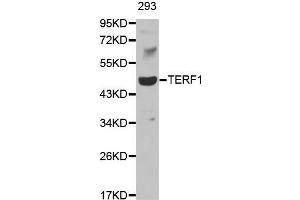 This gene encodes a telomere specific protein which is a component of the telomere nucleoprotein complex. This protein is present at telomeres throughout the cell cycle and functions as an inhibitor of telomerase, acting in cis to limit the elongation of individual chromosome ends. The protein structure contains a C-terminal Myb motif, a dimerization domain near its N-terminus and an acidic N-terminus. Two transcripts of this gene are alternatively spliced products.,TERF1,PIN2,TRBF1,TRF,TRF1,hTRF1-AS,t-TRF1,Epigenetics & Nuclear Signaling,Cell Biology & Developmental Biology,Apoptosis,TERF1