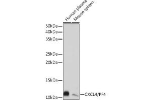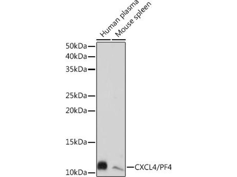 This gene encodes a member of the CXC chemokine family. This chemokine is released from the alpha granules of activated platelets in the form of a homotetramer which has high affinity for heparin and is involved in platelet aggregation. This protein is chemotactic for numerous other cell type and also functions as an inhibitor of hematopoiesis, angiogenesis and T-cell function. The protein also exhibits antimicrobial activity against Plasmodium falciparum. [provided by RefSeq, Oct 2014],CXCL4, PF-4, SCYB4,Angiogenesis,Blood,Cardiovascular,Cell Intrinsic Innate Immunity Signaling Pathway,Cytokines,Immunology & Inflammation,Innate Immunity_Chemokines,PF4