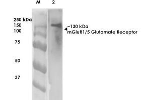 - Detects ~130 kDa (both mGluR1 and mGluR5).