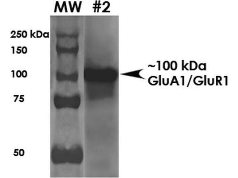- Detects ~100 kDa. Does not cross-react with GluR2.