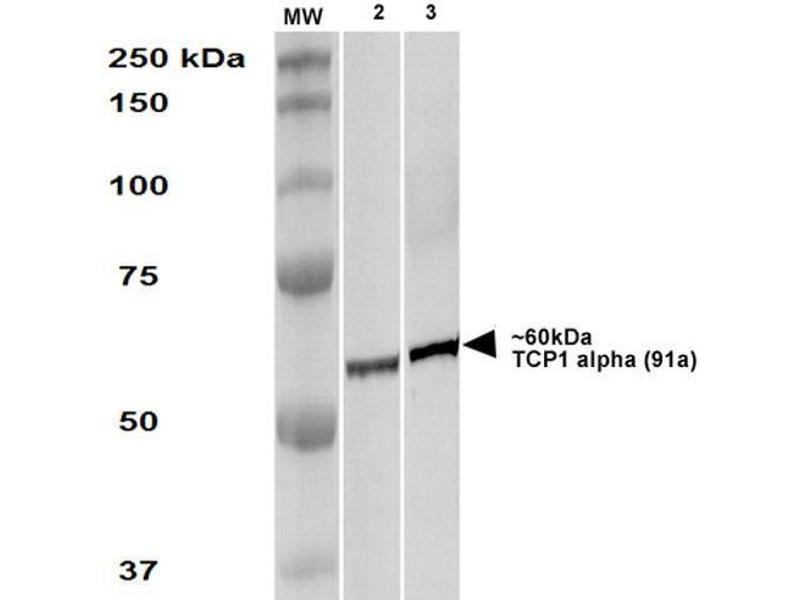 - Detects ~60 & ~92 kDa. Cross reactivity with human HSP60 in WB. Reacts weakly with S. cerevisiae, consistent with the epitope being AKLRS (instead of AKLRA). In C. elegans, it reacts with TCP1 alpha and another CCT subunit. In plants, it recog TCP1 of P. sativum, and the sequence of A. thalania TCP1 over the region of the epitope AKLRA. It has also been shown that it reacts with a subunit of a specialized chaperonin which folds phytochrome.