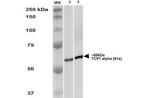 1 μg/ml of ABIN1686651 was sufficient for detection of TCP1 alpha in 20 μg of 3T3 cell lysate by colorimetric immunoblot analysis using Goat anti-rat IgG:HRP as the secondary antibody.