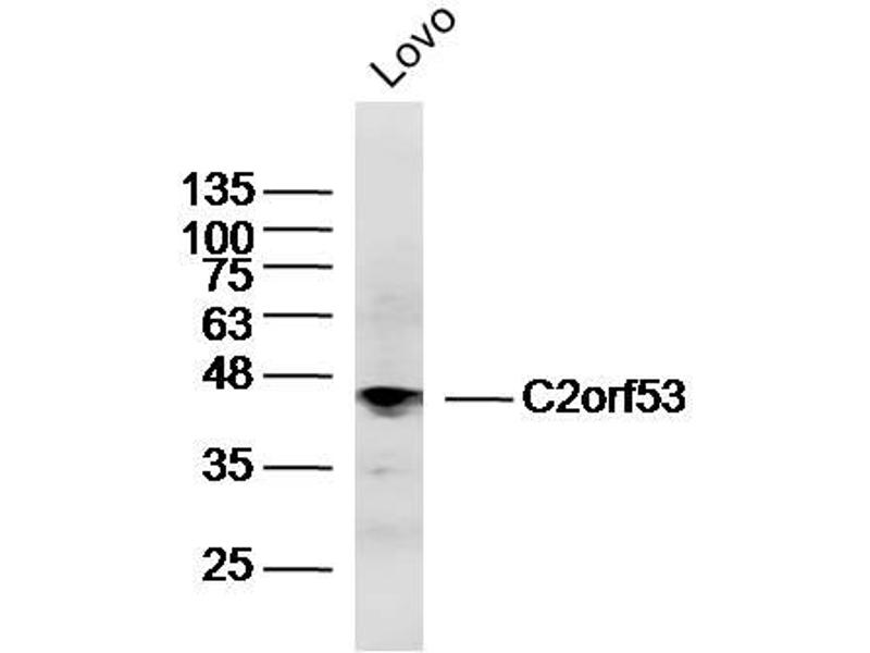 Background: C2orf53 (chromosome 2 open reading frame 53), also known as MGC44505, is a 412 amino acid protein that is encoded by a gene located on human chromosome 2p23.3. The second largest human chromosome, chromosome 2 consists of 237 million bases, encodes over 1,400 genes and makes up approximately 8 % of the human genome. A number of genetic diseases are linked to genes on chromosome 2. Harlequin icthyosis, a rare and morbid skin deformity, is associated with mutations in the ABCA12 gene. The lipid metabolic disorder sitosterolemia is associated with ABCG5 and ABCG8. An extremely rare recessive genetic disorder, Alstr syndrome is due to mutations in the ALMS1 gene. Interestingly, chromosome 2 contains what appears to be a vestigial second centromere and vestigial telomeres which gives credence to the hypothesis that human chromosome 2 is the result of an ancient fusion of two ancestral chromosomes seen in modern form today in apes.