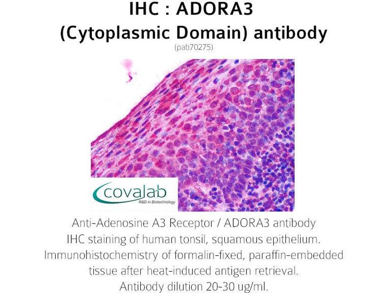 - Synthetic 16 amino acid peptide from 3rd cytoplasmic domain of human ADORA3. Percent identity with other species by BLAST analysis: Human (100%), Monkey (100%), Marmoset (100%), Dolphin (100%), Elephant (100%), Dog (100%), Horse (100%), Pig (100%), O ...
