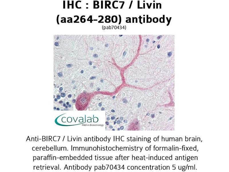 - Reacts with synthetic peptide (CRAPVRSRVRTFLS) corresponding to amino acids 264 to 280 of the short form and 281 to 298 of the long form of human Livin (1,3) This sequence is identical between a and b forms of the Livin proteins