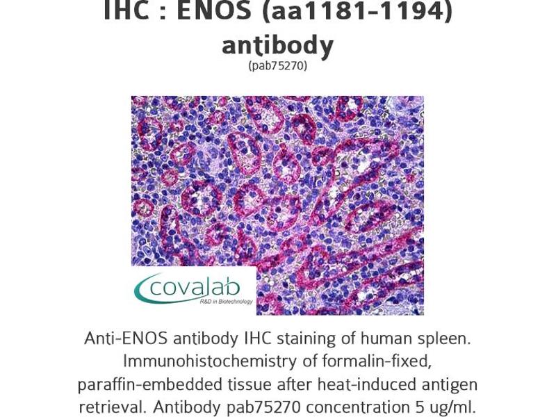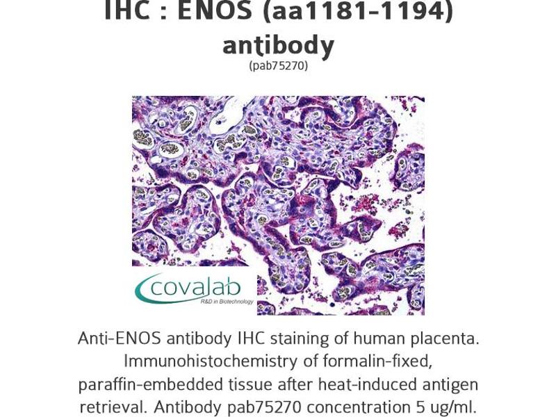 - KLH-conjugated, synthetic peptide corresponding to aa1181-1194 (CQERQLRGAVPWAFD) of human eNOS/NOS III. The immunizing sequence has 10/11 identical amino acids in mouse, guinea pig, bovine, porcine, rat and canine.
