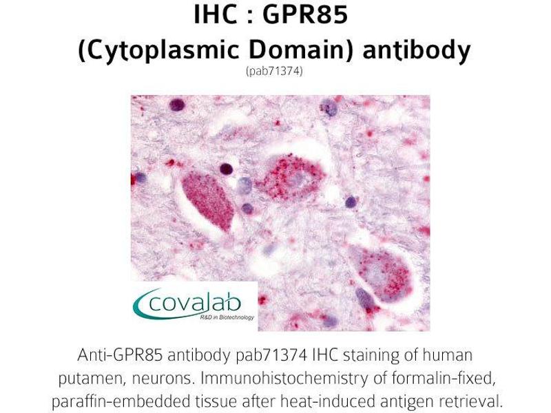- Synthetic 18 amino acid peptide from 3rd cytoplasmic domain of human GPR85. Percent identity with other species by BLAST analysis: Human (100%), Gorilla (100%), Orangutan (100%), Gibbon (100%), Monkey (100%), Marmoset (100%), Mouse (100%), Rat (100%)