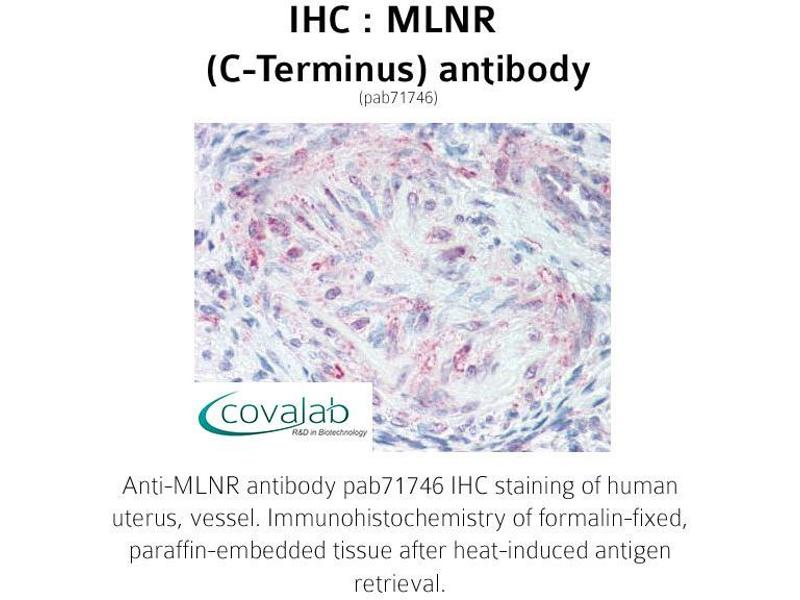 - Synthetic 16 amino acid peptide from C-terminal cytoplasmic domain of human MLNR. Percent identity with other species by BLAST analysis: Human (100%), Gorilla (100%), Marmoset (81%).