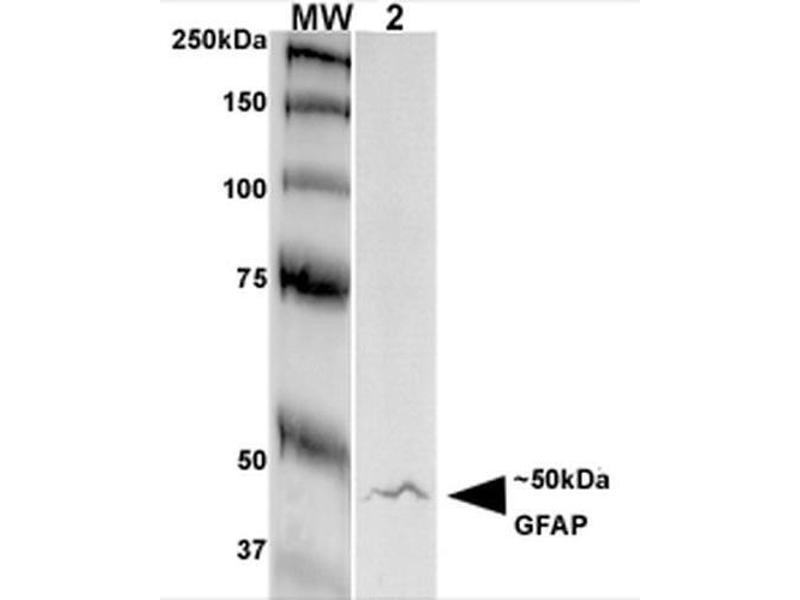 - Detects ~50 kDa. Cross-reacts with GFAP-R416W and other GFAP mutant proteins.