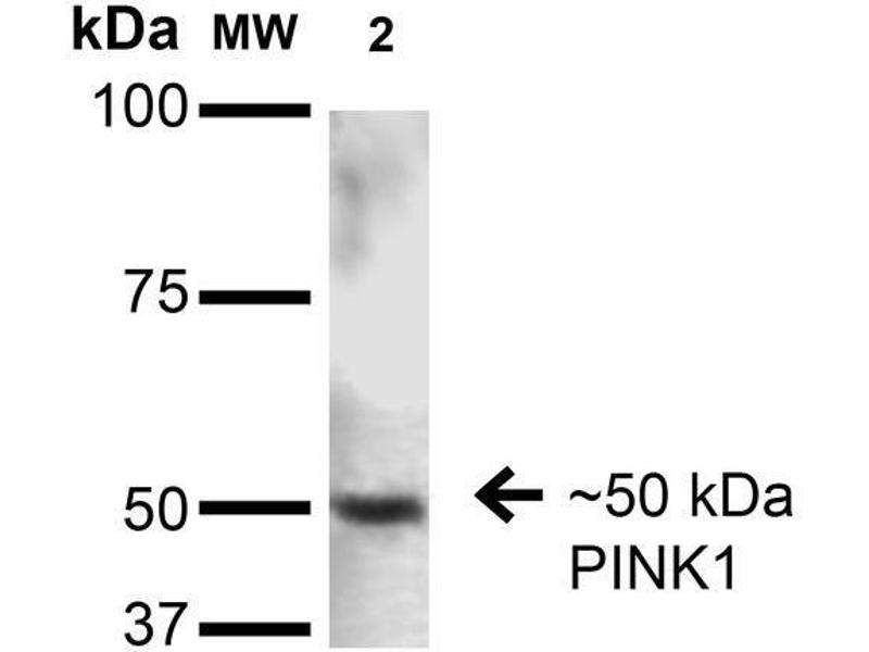 1 μg/ml of ABIN1741108 was sufficient for detection of PINK1 in 20 μg of rat brain lysate by colorimetric immunoblot analysis using Goat anti-mouse IgG:HRP as the secondary antibody.