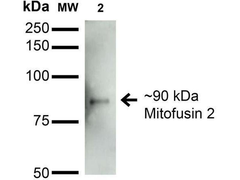 1 μg/ml of ABIN1741249 was sufficient for detection of Mitofusin-2 in 20 μg of mouse cardiac mitochondrial lysate by colorimetric immunoblot analysis using Goat anti-mouse IgG:HRP as the secondary antibody.