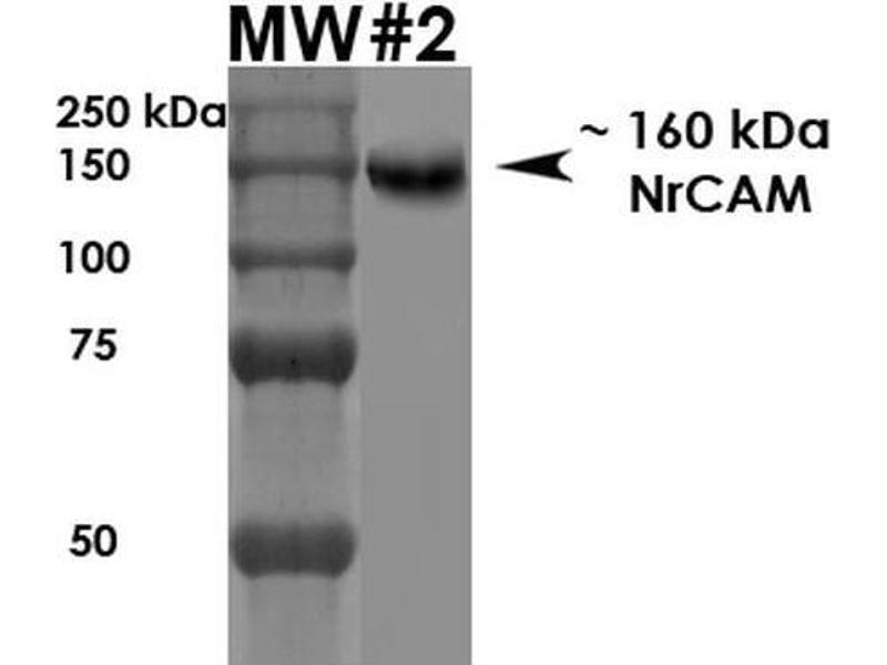 1 μg/ml of ABIN1741298 was sufficient for detection of NrCAM in 20 μg of rat brain lysate by colorimetric immunoblot analysis using Goat anti-mouse IgG:HRP as the secondary antibody.