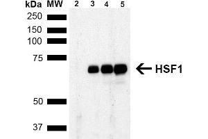 - HSF1, or heat shock factor 1, belongs to a family of Heat Shock transcription factors that activate the transcription of genes encoding products required for protein folding, processing, targeting, degradation, and function (2). The up-regulation of HSP (heat shock proteins) expression by stressors is achieved at the level of transcription through a heat shock element (HSE) and a transcription factor (HSF) (3, 4, 5). Most HSFs have highly conserved amino acid sequences. On all HSFs there is a DNA binding domain at the N-terminus. Hydrophobic repeats located adjacent to this binding domain are essential for the formation of active trimers. Towards the C-terminal region another short hydrophobic repeat exists, and is thought to be necessary for suppression of trimerization (6). There are two main heat shock factors, 1 and 2. Mouse HSF1 exists as two isoforms, however in higher eukaryotes HSF1 is found in a diffuse cytoplasmic and nuclear distribution in un-stressed cells. Once exposed to a multitude of stressors, it localizes to discrete nuclear granules within seconds. As it recovers from stress, HSF1 dissipates from these granules to a diffuse nuceloplasmic distribution. HSF2 on the other hand is similar to mouse HSF1, as it exists as two isoforms, the alpha form being more transcriptionally active than the smaller beta form (7, 8). Various experiments have suggested that HFS2 may have roles in differentiation and development (9, 10, 11).