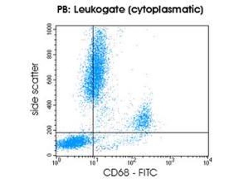 CD68 (macrosialin) is a type-one membrane protein with significant sequence homology to a family of lysosomal-associated glycoproteins (lamp). CD68 molecules are predominantly located intracellularily in cytoplasmic granules but can also be detected in smaller amounts at the cell surface. Particular strong intracellular expression is observed for monocytes and macrophages. In addition, Langerhans cells as well as plasmacytoid dendritic cells express clear-cut levels of CD68. Low-level reactivity is also observed with a subset of B lymphocytes and activated T lymphocytes. Oxidized low-density lipoprotein is a ligand for CD68. The CD68 mAb permits the identification and enumeration of monocytes, Langerhans cells and plasmacytoid dendritic cells (in combination with CD4/CD56 staining) in normal and malignant human blood and bone marrow samples using flow cytometry. Results must be put within the context of other diagnostic tests as well as the clinical history of the patient by a certified professional before final interpretation. Analyses performed with this antibody should be paralleled by positive and negative controls.