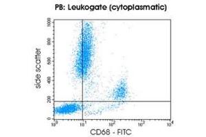 - Permeabilization and Staining Procedure - In combination with our Permeabilization Kit FIX&PERM- (ABIN1741575) intracellular CD68 can be easily stained in cell suspensions. - For each sample to be analyzed add 50 µL of whole blood, bone marrow or mononuclear cell suspension in a 5 mL tube - Add 100 µL of Reagent A (Fixation Medium, stored and used at room temperature) - Incubate for 15 minutes at room temperature- Add 5 mL phosphate buffered saline and centrifuge cells for 5 minutes at 300 g - Remove supernatant and add to cell pellet 100µl Reagent B (Permeabilization Medium) and 20 µL of the CD68 monoclonal antibody conjugate - Vortex at low speed for 1-2 seconds - Incubate for 15 minutes at room temperature - Wash cells with phosphate buffered saline as described above - Remove supernatant and resuspend cells in sheath fluid for immediate analysis or resuspend cells in 0.5 mL 1.0 % formaldehyde and store them at 2-8°C in the dark. Analyze fixed cells within 24 hours