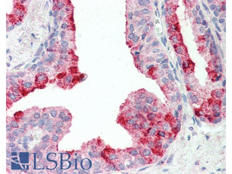 Immunohistochemistry: Paraffin embedded Human Prostate. Recommended concentration: 5 μg/mL.