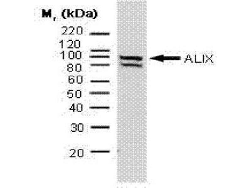 This antibody recognises apoptotic-linked-gene-product 2 (ALG-2) interacting protein X (ALIX), a conserved adaptor protein which is ubiquitously expressed.