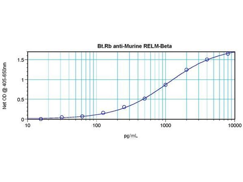 ELISA: Direct: To detect mRELMβ (using 100 μL/well antibody solution) a concentration of0.25 - 1.0 μg/mL of this antibody is required. In conjunction with compatible secondaryreagents, it allows the detection of at least 0.2 - 0.4 ng/well of recombinant mRELMβ. Sandwich: To detect mRELMβ (using 100 μL/well antibody solution) a concentration of0.25 - 1.0 μg/mL of this antibody is required. In conjunction with Polyclonal Anti-MurineRELMβ as a capture antibody, it allows the detection of at least 0.2 - 0.4 ng/well ofrecombinant mRELMβ. Western Blot: To detect mRELMβ by Western Blot analysis this antibody can be used at aconcentration of 0.1 - 0.2 μg/mL. Used in conjunction with compatible secondary reagentsthe detection limit for recombinant mRELMβ is 1.5 - 3.0 ng/lane, under either reducing ornon-reducing conditions. Other applications not tested. Optimal dilutions are dependent on conditions and should be determined by the user.