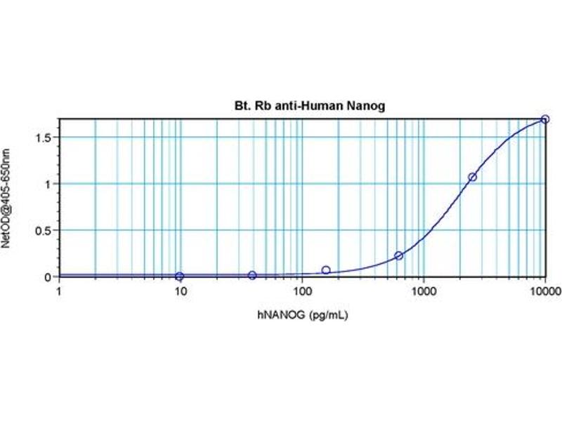 ELISA: Direct: To detect hNanog (using 100 μL/well antibody solution) a concentration of0.25 - 1.0 μg/mL of this antibody is required. In conjunction with compatible secondaryreagents, it allows the detection of at least 0.2 - 0.4 ng/well of recombinant hNanog. Sandwich: To detect hNanog (using 100 μL/well antibody solution) a concentration of0.25 - 1.0 μg/mL of this antibody is required. In conjunction with Polyclonal Anti-HumanNanog as a capture antibody, it allows the detection of at least 0.2 - 0.4 ng/well ofrecombinant hNanog. Western blot: To detect hNanog this antibody can be used at a concentration of0.1 - 0.2 μg/mL. Used in conjunction with compatible secondary reagents the detectionlimit for recombinant hNanog is 1.5 - 3.0 ng/lane, under either reducing or non-reducingconditions.