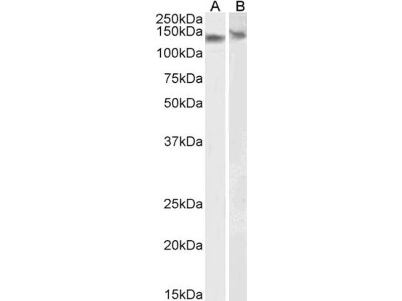 Western Blot: Approx 140 kDa band observed in lysates of cell line HeLa, HepG2 and Jurkat (calculated MW of 126.9 kDa according to Human NP_001914.3). Recommended concentration: 1-2 μg/mL. Approx 140 kDa band observed in lysates of cell line NIH3T3 and app