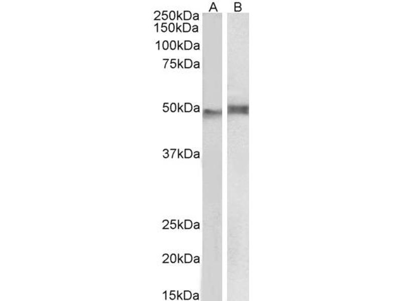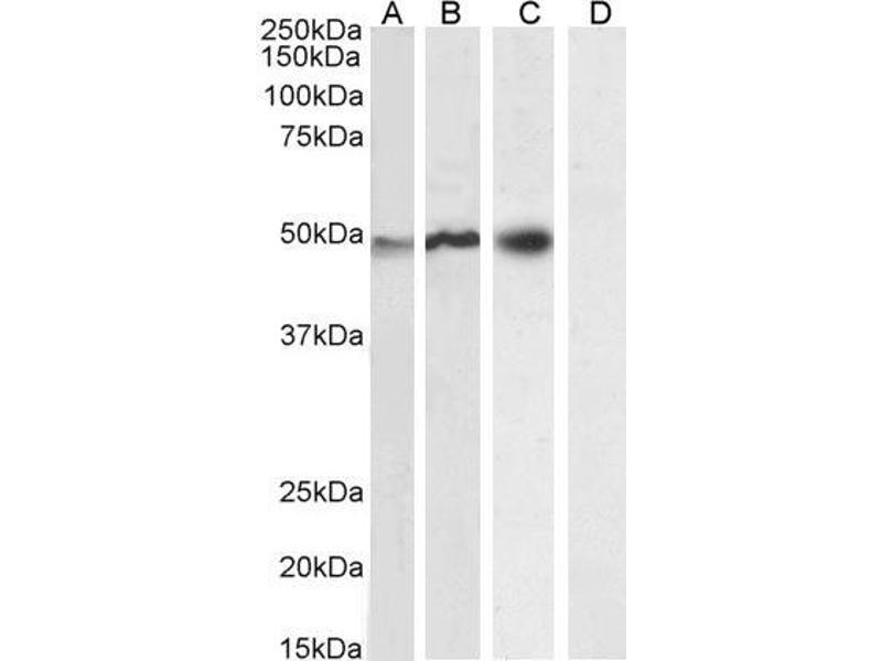 Western Blot: Approx 48 kDa band observed in lysates of cell lines Daudi, U251 and U937 and in Mouse Thymus, and approx, 50 kDa in Pig Spleen lysates (calculated MW of 44.7 kDa according to Human NP_000256.4, 46.0 kDa according to Mouse NP_001272966.1 and 45