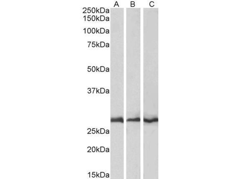 Western Blot: Approx 30 kDa band observed in lysates of cell lines Jurkat, HeLa and NIH-3T3 and approx 28 kDa band observed in Mouse, Rat and Pig Heart lysates (calculated MW of 30.6 kDa according to Human NP_004921.1 and 31.3 kDa according to Mouse NP_00103