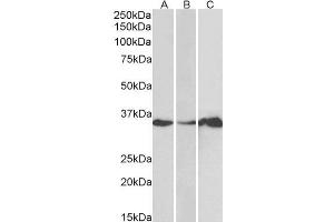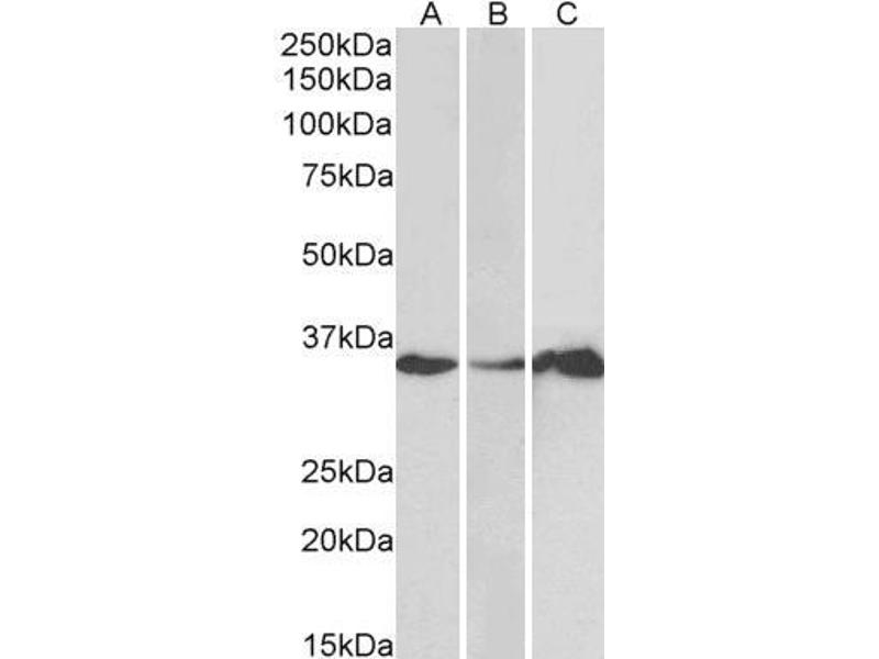 Western Blot: Approx 35 kDa band observed in Human Brain (Cerebellum) and Human Colon, Duodenum, Liver and Pancreas lysates (calculated MW of 29.7 kDa according to NP_006139.1). Recommended concentration: 1-3 μg/mL.