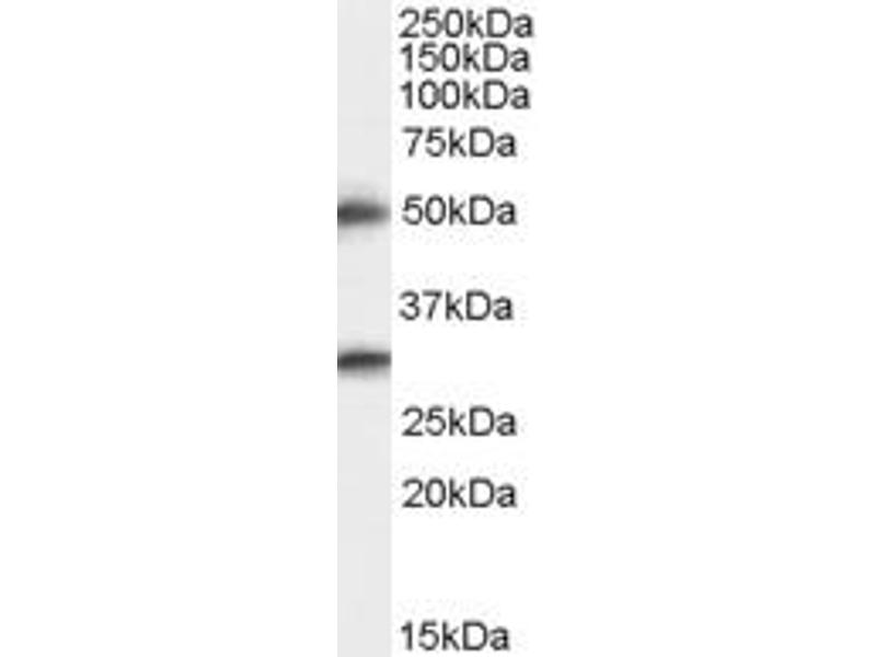 Western Blot: Experiments gave bands at approx 50 kDa and 29 kDa in Human Brain (Cerebral Cortex). These bands correspond to earlier findings in literature with different antibodies (Yamaguchi et al, J Biol Chem. 2002 Mar 1,277(9):6806-12, PMID: 11741986).