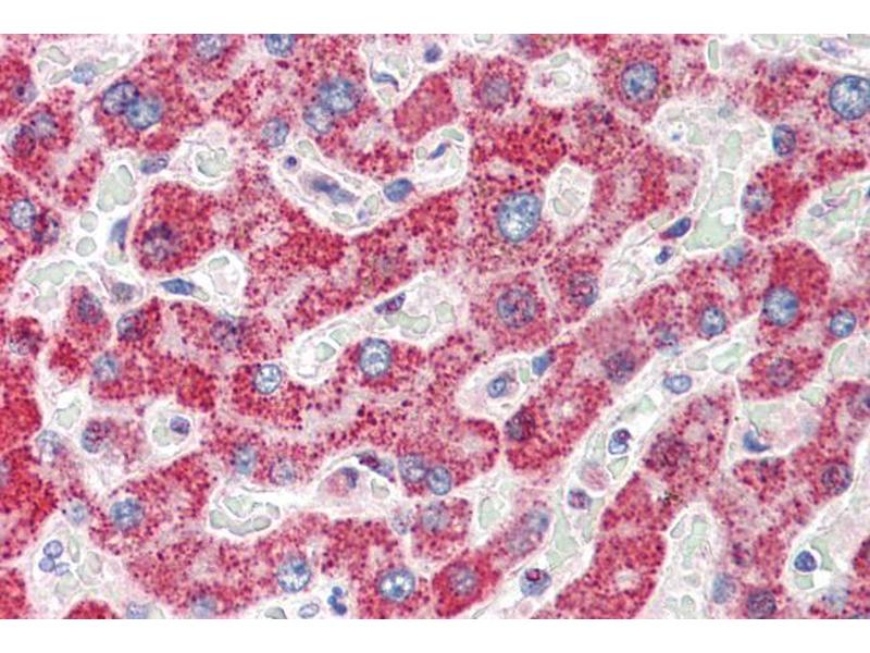 Immunohistochemistry: Paraffin embedded Human Liver and Small Intestine. Recommended concentration: 5 μg/mL.