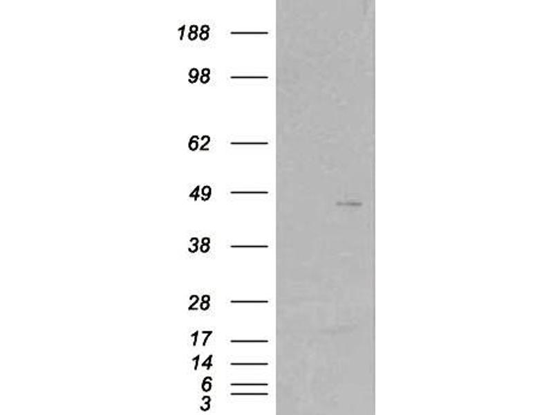 Western Blot: Approx 38 kDa band observed in lysates of cell line Jurkat (calculated MW of 41.2 kDa according to NP_003921.2). In transfected HEK293 transiently expressing SKAP2 a band of approx. 45 kDa is observed. This band is not observed in the non-tran