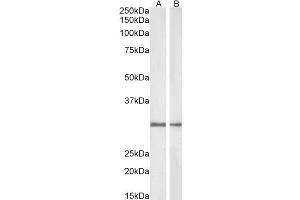 Western Blot: Approx. 30 kDa band observed in lysates of cell lines U251 and HepG2 and in Human Kidney, Lung and Duodenum lysates, and approx. 30-32 kDa band in Rat Kidney, Lung and Duodenum lysates (calculated MW of 30.9 kDa according to Human NP_000894.1