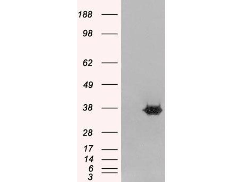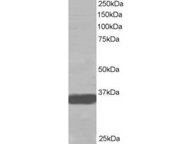 Western Blot: Approx 35 kDa band observed in lysates of cell line A431 (calculated MW of 32.3 kDa according to NP_036418.1). In transfected HEK293 transiently expressing MORF4L2 a band of approx. 37 kDa is observed. This band is not observed in the non-tran