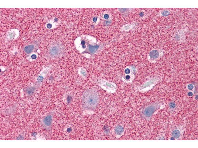 Immunohistochemistry: Paraffin embedded Human Brain (Cortex) and (Cerebellum) and Testis. Recommended concentration: 3.75 μg/mL.