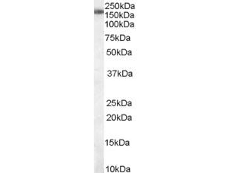 Western Blot: Approx 170 kDa band observed in lysates of cell lines Daudi, Jurkat and MOLT4 (calculated MW of 111 kDa according to NP_055521.1). The observed molecular weight corresponds to earlier findings in literature with different antibodies (Yang e